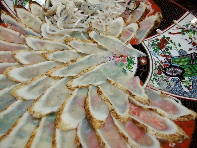 The thrill of eating something dangerous can be addictive. Who doesn't want to be a badass? A full meal of fugu will cost about 20,000 yen or about $200 dollars while a smaller dish can cost anywhere between 2,000 to 5,000 yen ($20-$50 dollars). A special knife, called the fugu hiki, is a long slender knife used to cut the fish into delicate, thin slices. Fugu is often eaten raw as sashimi. Other times, fugu is served boiled, fried, grilled with teriyaki sauce, as a stew, or as a sake. The fugu chef cuts the fish into paper-thin slices. The flavor is said to taste like chicken with a jelly-like texture. This is the true chicken of the sea... but deadly .